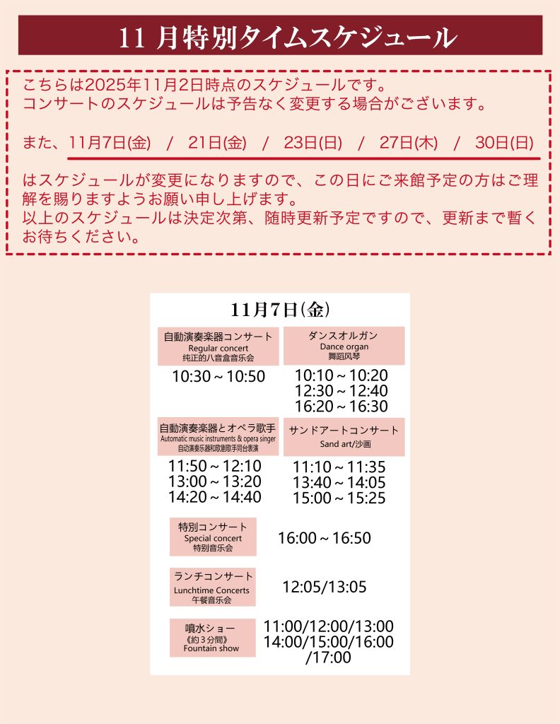 | 噴水ショー | 11:00/12:00/13:00/14:00/15:00/16:00/17:00 |