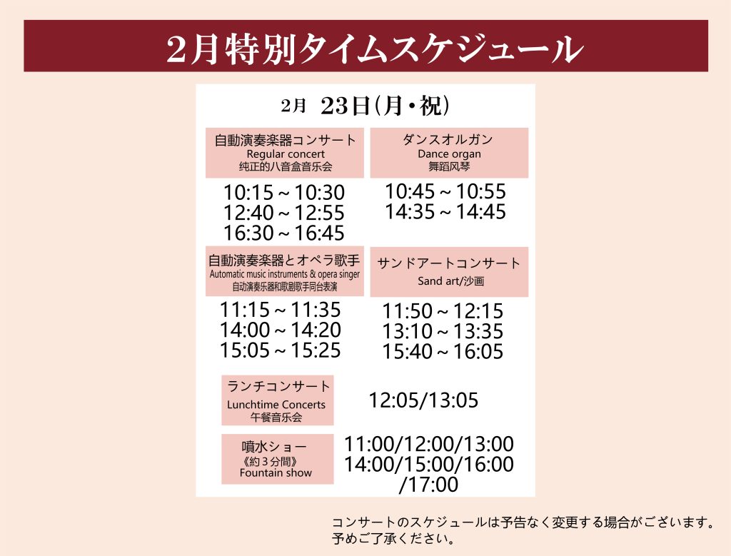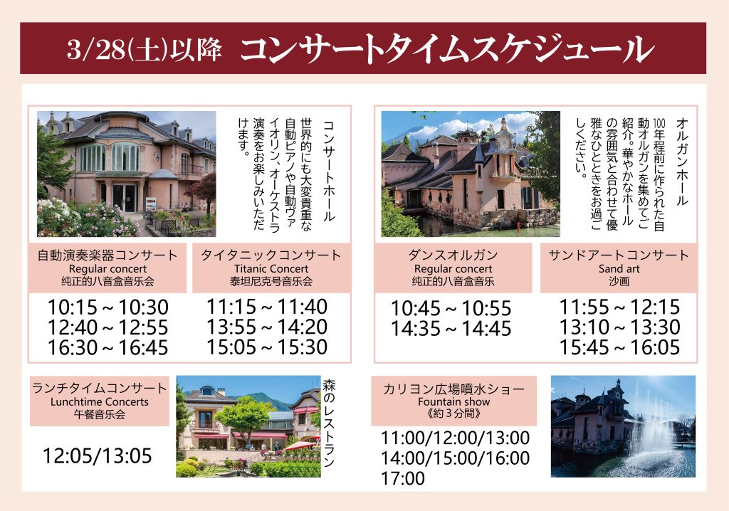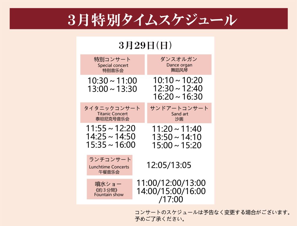 | 噴水ショー | 11:00/12:00/13:00/14:00/15:00/16:00/17:00 |