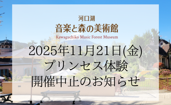 いつも河口湖音楽と森の美術館 へご来館頂き誠にありがとうございます。2025年11月21日(金)のプリンセス体験ですが、ブライダルのため終日中止とさせて頂きます。ご来店のお客様には大変ご迷惑をおかけ致しますが、ご理解の程 […]