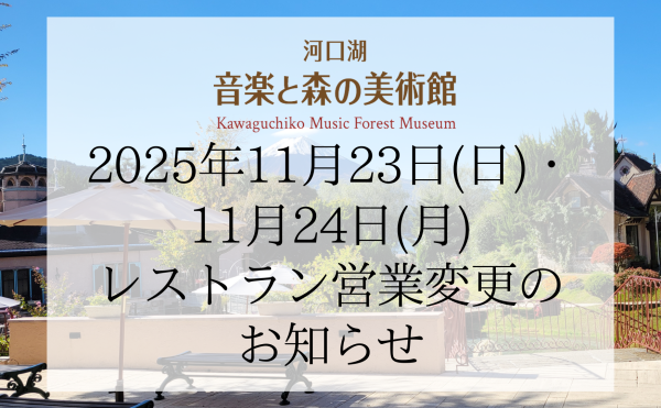 いつも河口湖音楽と森の美術館 森のレストランへご来店頂き誠にありがとうございます。2025年11月23日(日)及び11月24日(月)は貸切のため下記営業時間に変更致します。ご来店のお客様には大変ご迷惑をおかけ致しますが、 […]