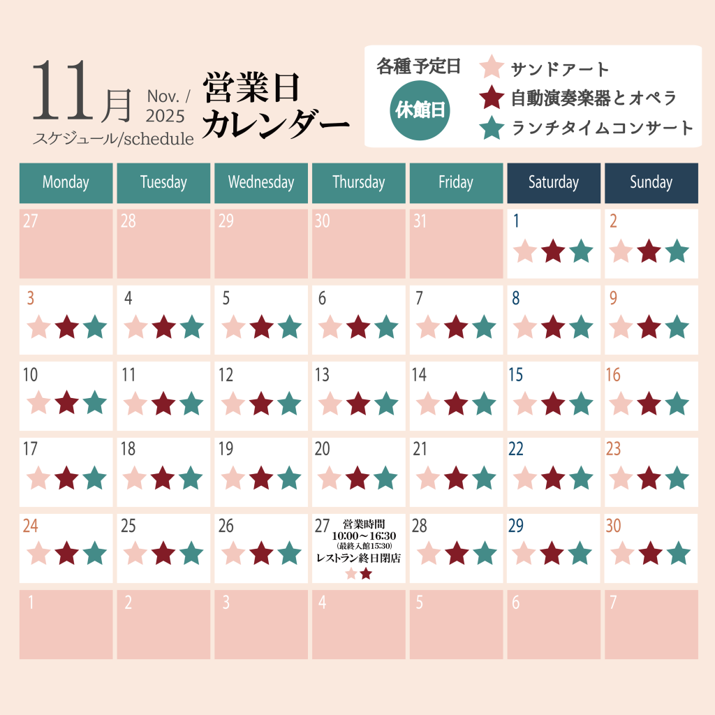※11月27日(木)のみ貸切のため、10:00~16:30(最終入館15:30)になります。レストランは終日閉店となります。くわしくはこちらから