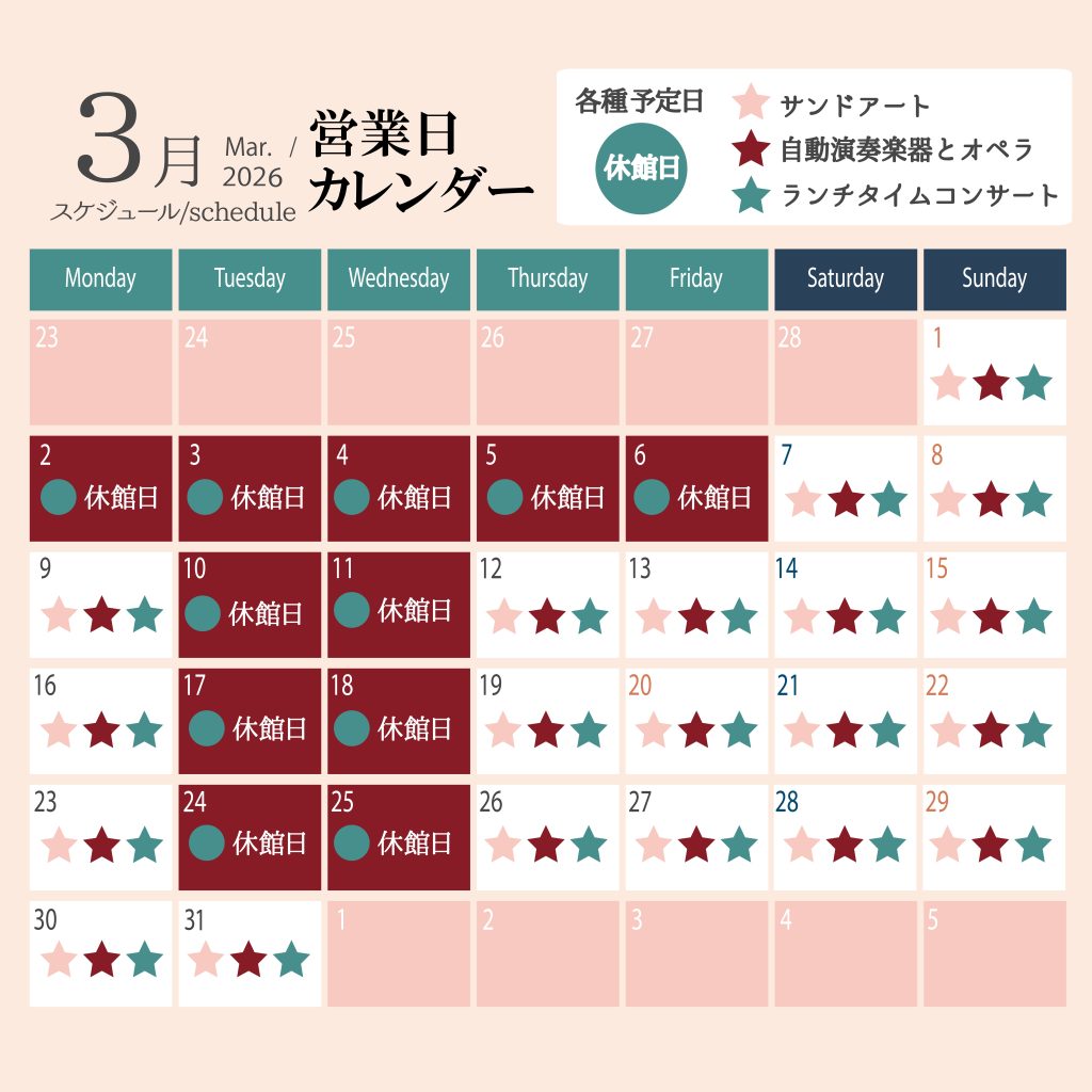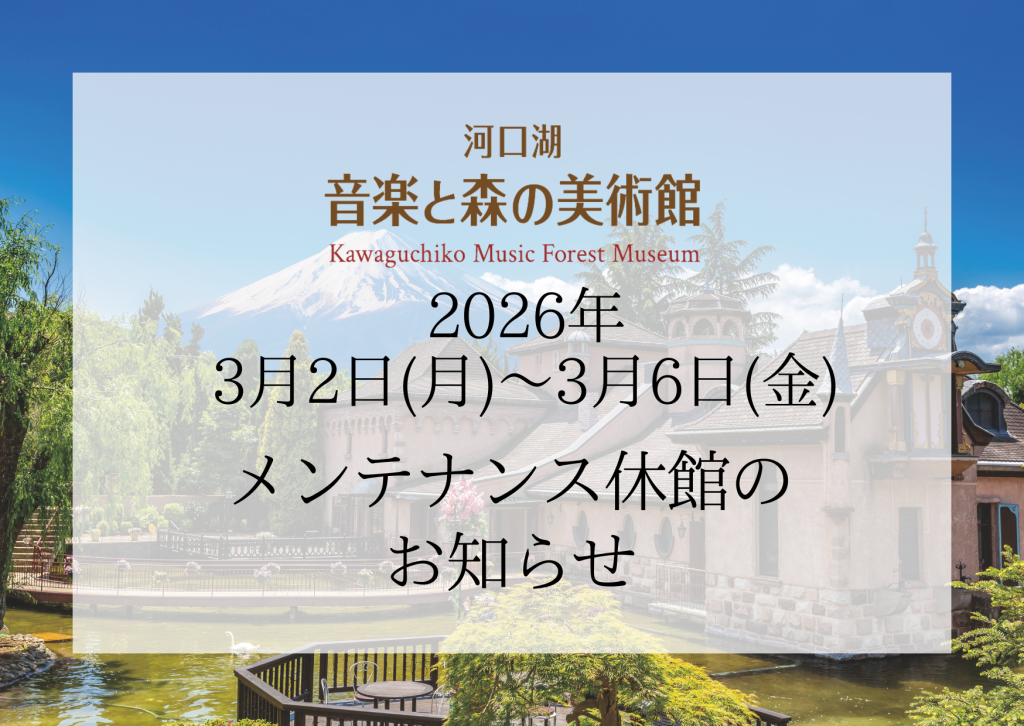 いつも河口湖音楽と森の美術館へお越し頂き誠にありがとうございます。当館は2026年3月2日(月)~3月6日(金)まで館内メンテナンスのため休館日とさせていただきます。ご来館のお客様には大変ご迷惑をお掛けいたしますが、ご理解の程お願い申し上げます。お客様のお越しをスタッフ一同お待ちしております。