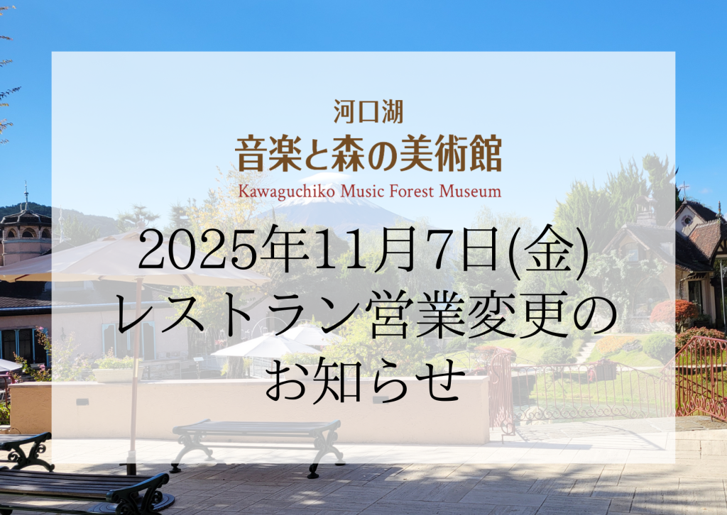 いつも河口湖音楽と森の美術館 森のレストランへご来店頂き誠にありがとうございます。2025年11月7日(金)は貸切のため下記営業時間に変更致します。ご来店のお客様には大変ご迷惑をおかけ致しますが、ご理解の程お願い申し上げます。