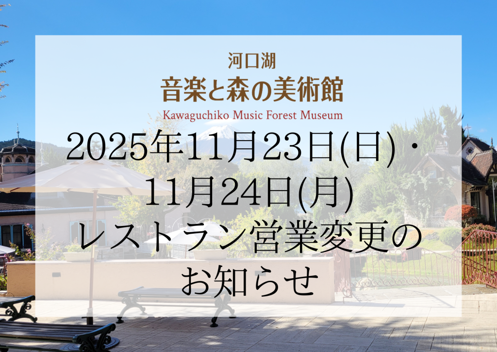 いつも河口湖音楽と森の美術館 森のレストランへご来店頂き誠にありがとうございます。2025年11月23日(日)及び11月24日(月)は貸切のため下記営業時間に変更致します。ご来店のお客様には大変ご迷惑をおかけ致しますが、ご理解の程お願い申し上げます。