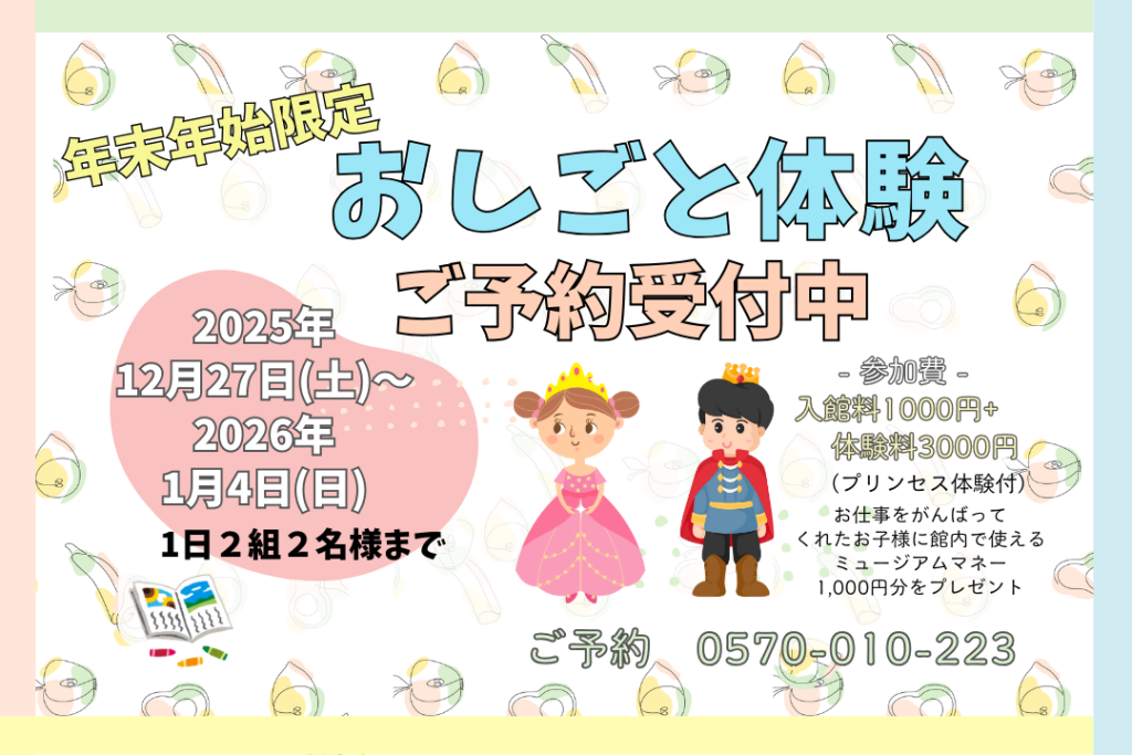 | 料金 | 入館料1,000+体験料3,000円(税込)※プリンセス体験付 ※館内で使えるミュージアムマネー1,000円分と認定証をプレゼント🎁 |