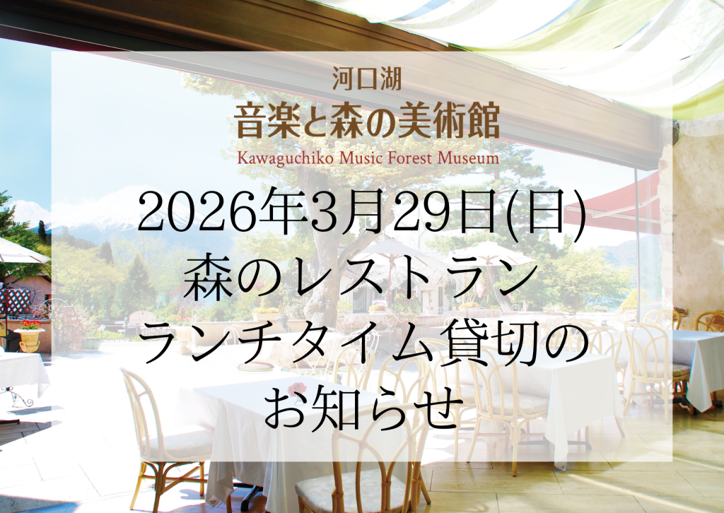 いつも河口湖音楽と森の美術館 森のレストランへご来店頂き誠にありがとうございます。2026年3月29日(日)は団体ご予約のためランチタイム時間は貸切となります。ご来店のお客様には大変ご迷惑をおかけ致しますが、ご理解の程お願い申し上げます。